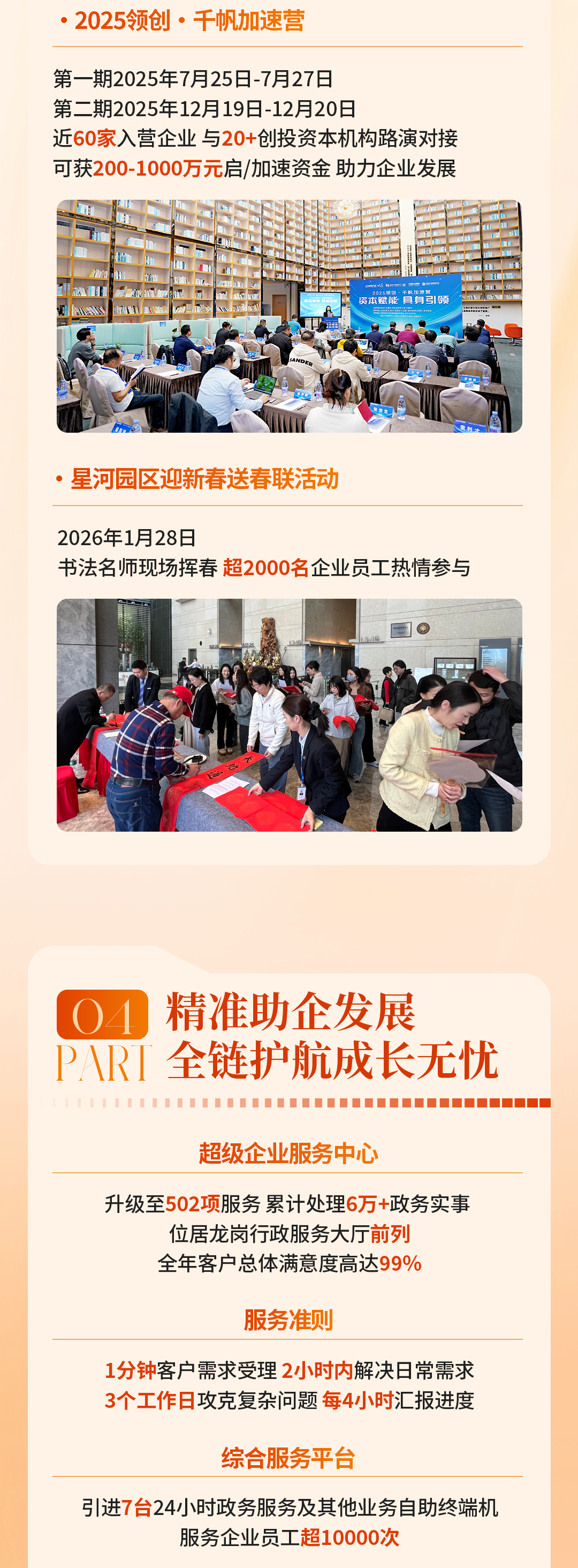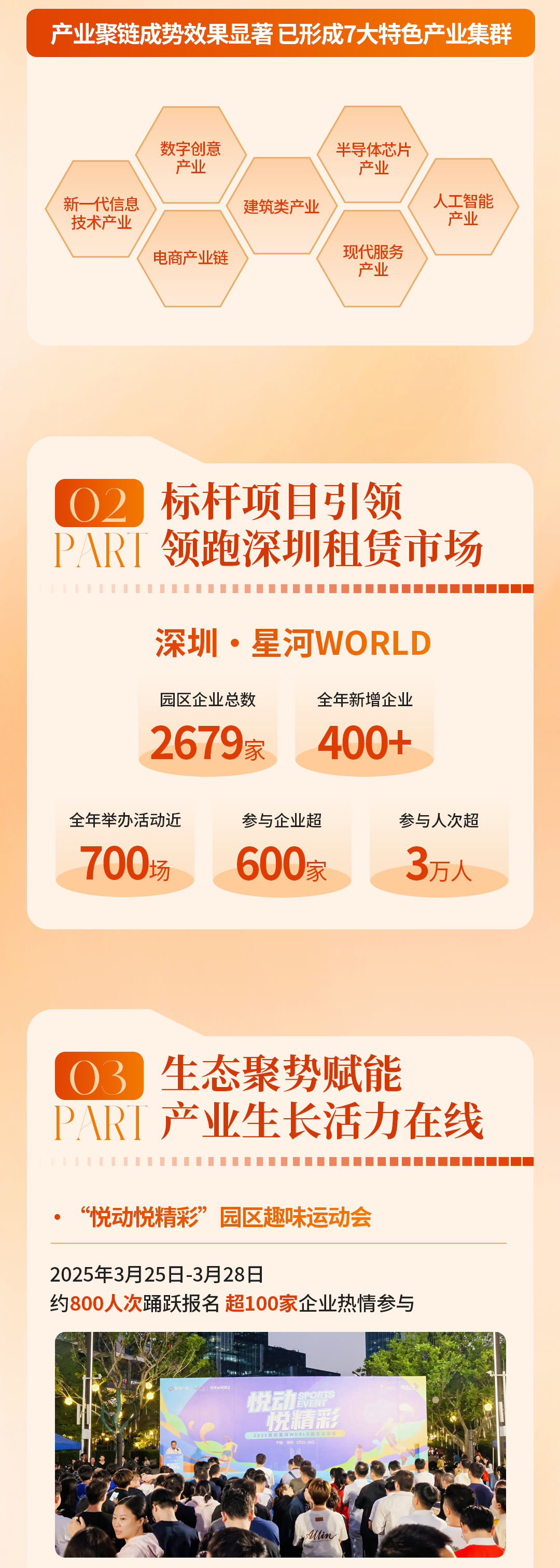 产业、企业、人才的发展离不开良好的营商环境,为提升产业竞争力,助推企业全生命周期成长,星河产业以联盟共享理念为核心,以资源运作为抓手,以平台生态圈建设为宗旨,与入驻企业、合作伙伴、地方政府等共建全方位产业运营服务体系,实现多方共生、共赢。